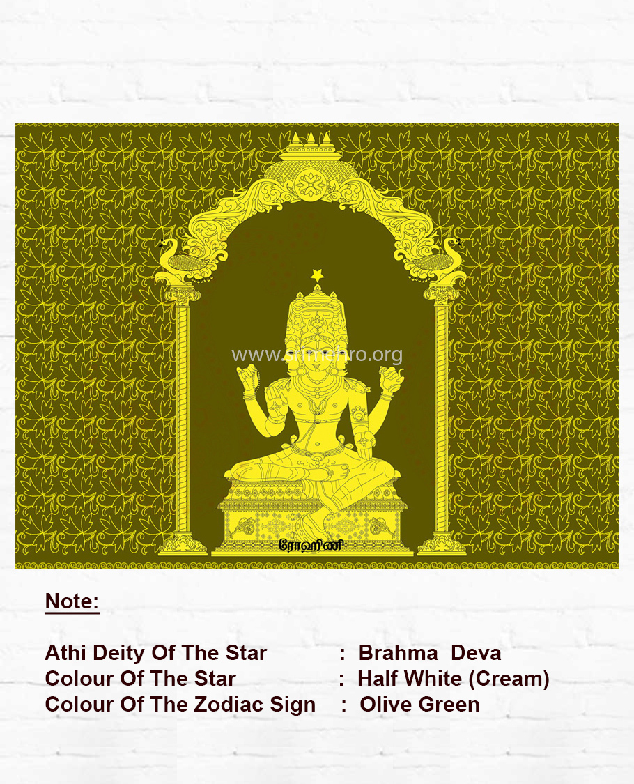 Rohini nakshathiram consists of five stars and it appears like a Cart and its Wheel in the sky. Adhi deva of this nakshathiram is Brahmadevan. Lord Krishna who was born in this rohini nakshathiram is the particular characteristic of this star