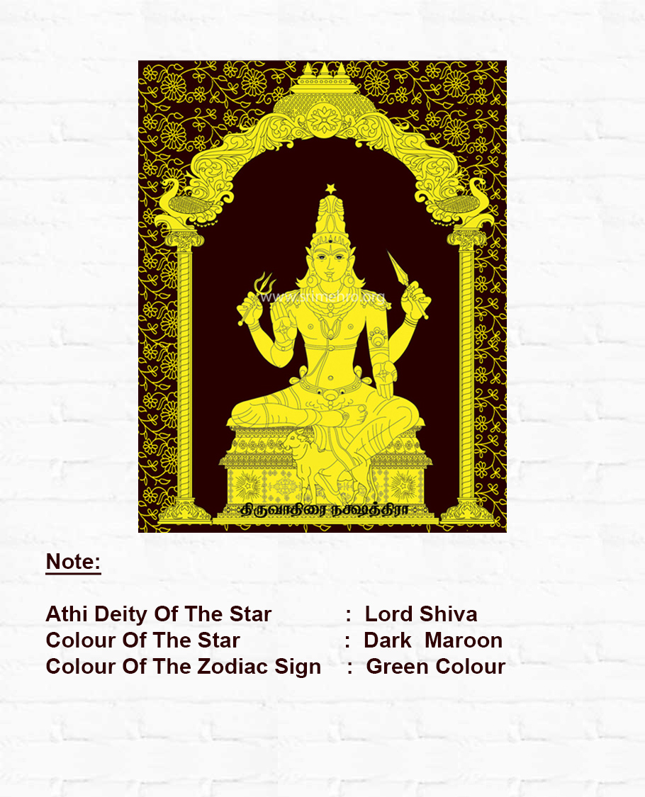 Thiruvathirai nakshathiram consists of a single star and it appears like a Bud of Lotus flower in the sky. The Adhideva of this nakshathiram is Rudhdhiran with his favourite animal bullock. Garuda bhagavan was born in the same star as Lord shiva`s natchathiram that is Thiruvathirai.